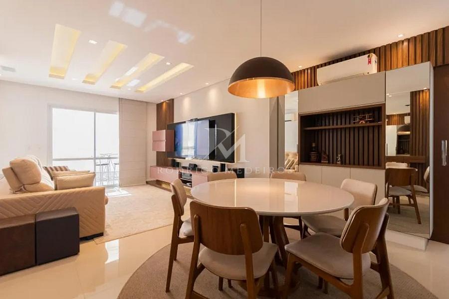 O imóvel conta ainda com acabamentos que agregam sofisticação, como piso em porcelanato, teto rebaixado em gesso com iluminação indireta e persianas elétricas, além de três vagas de garagem cobertas.